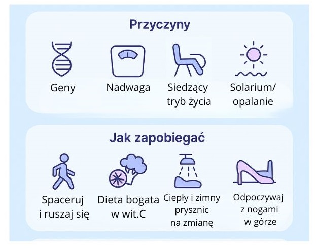 - siedzący lub stojący tryb życia – brak ruchu lub wielogodzinne stanie obciąża nogi,