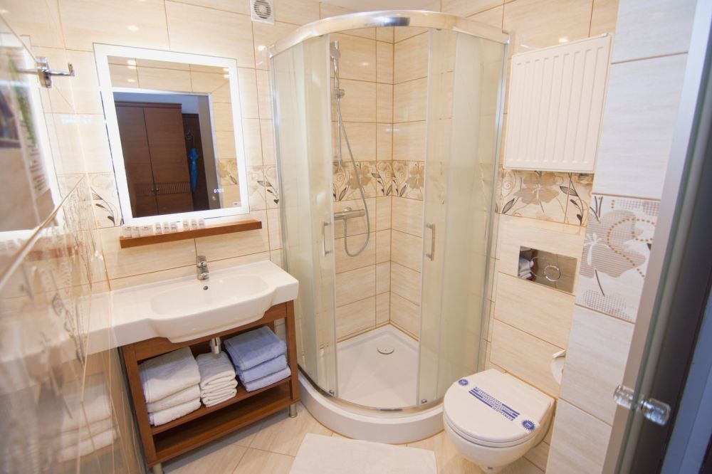V koupelně: sprchový kout, umyvadlo, WC, vysoušeč vlasů, sada ručníků.