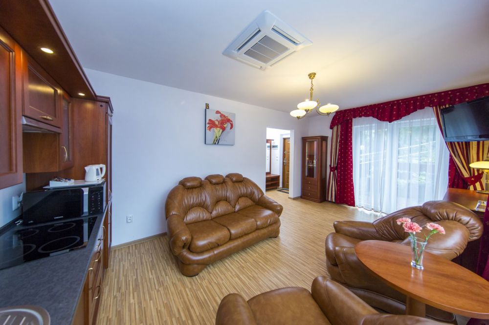 - living room with seating furniture made of leather (double sofa bed, bench table, 2 comfortable armchairs), TV-SAT, air-conditioning, kitchenette: electric kettle, tea and coffee facilities, microwave, freezer, fridge, electric cooker, automatic built-in washing machine.